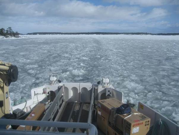 Här stångar sig Vaxholmettan in genom isen till Sollenkroka brygga
